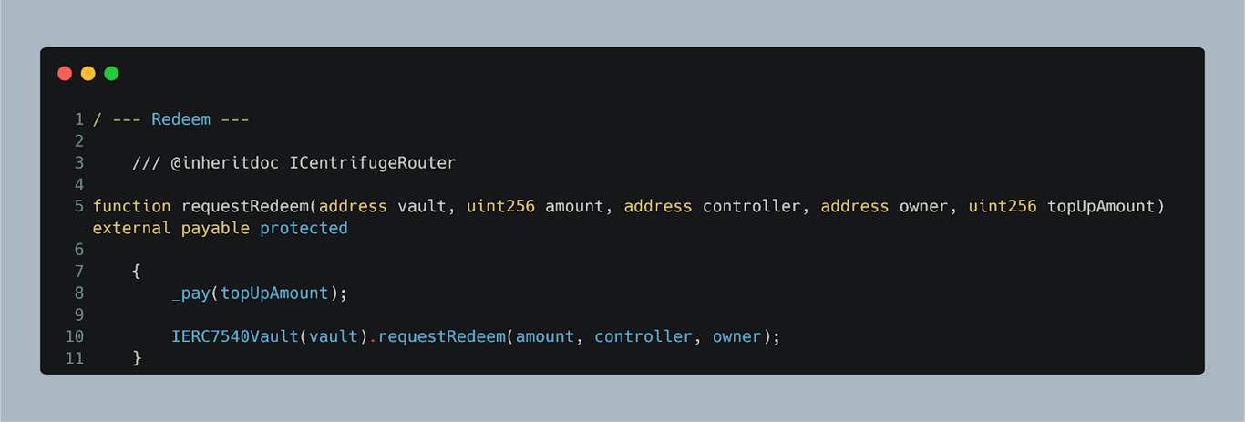 - requestRedeem(): The requestRedeem() function allows the router to withdraw assets from the vault. After the router has permission, it can call this function to redeem (or withdraw) a specified amount of assets from the vault, reducing its balance. This function is used by vault owners when they want to access the assets stored inside their vault.